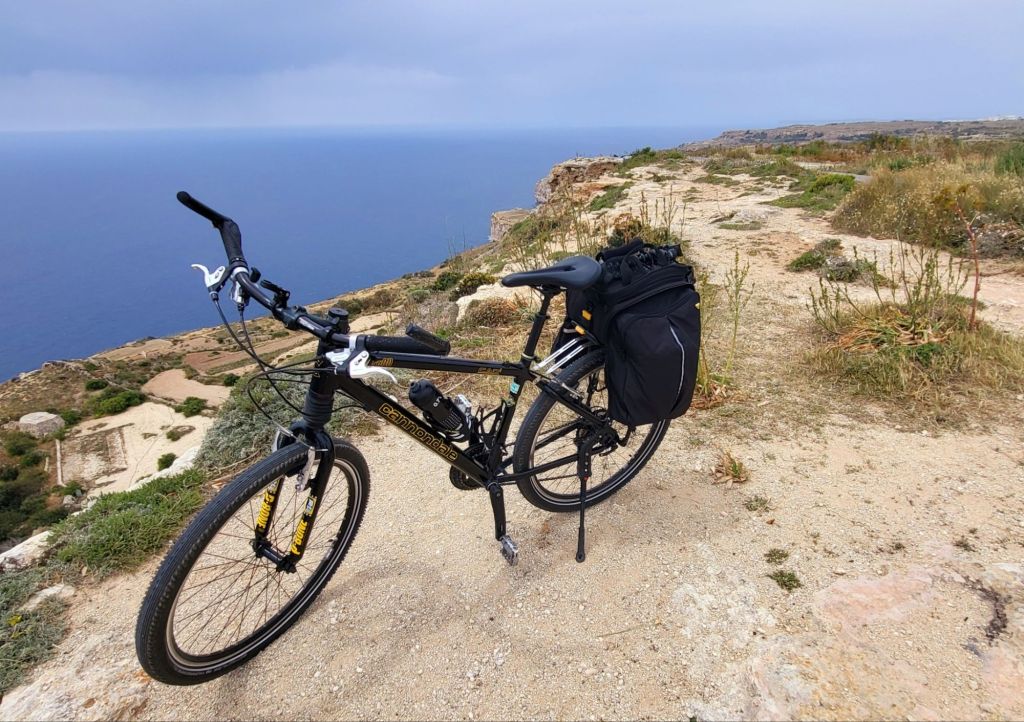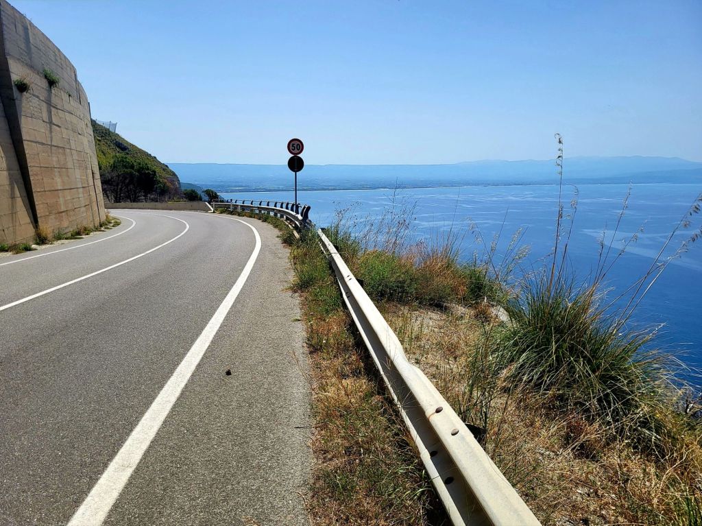 Es ging weiter immer etwas erhöht und in einem stetigen Auf und Ab, aber nie zu steil, der Küste entlang. Die Strasse war nicht immer im besten Zustand, doch es gelang mir den grössten Schlaglöchern auszuweichen. Zu sehr wollte ich mein altes Rad ja auch nicht strapazieren. Das Wetter zeigte sich von der besten Seite. Mit 25 Grad einfach traumhaftes Radlerwetter. Dazu immer wieder Ausblicke auf das türkisfarbene Meer. Was will man mehr?