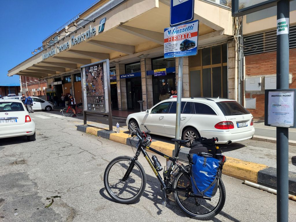Wie vereinbart fuhr er uns für 120 Euro in gut 90 Minuten nach Triest zum Bahnhof. Dort bauten wir die Räder wieder zusammen um einfacher zum Zug zu kommen. Es war sogar noch genug Zeit für ein verspätetes Frühstück im Zentrum von Triest, bevor wir mit dem Zug Richtung Venedig fuhren.