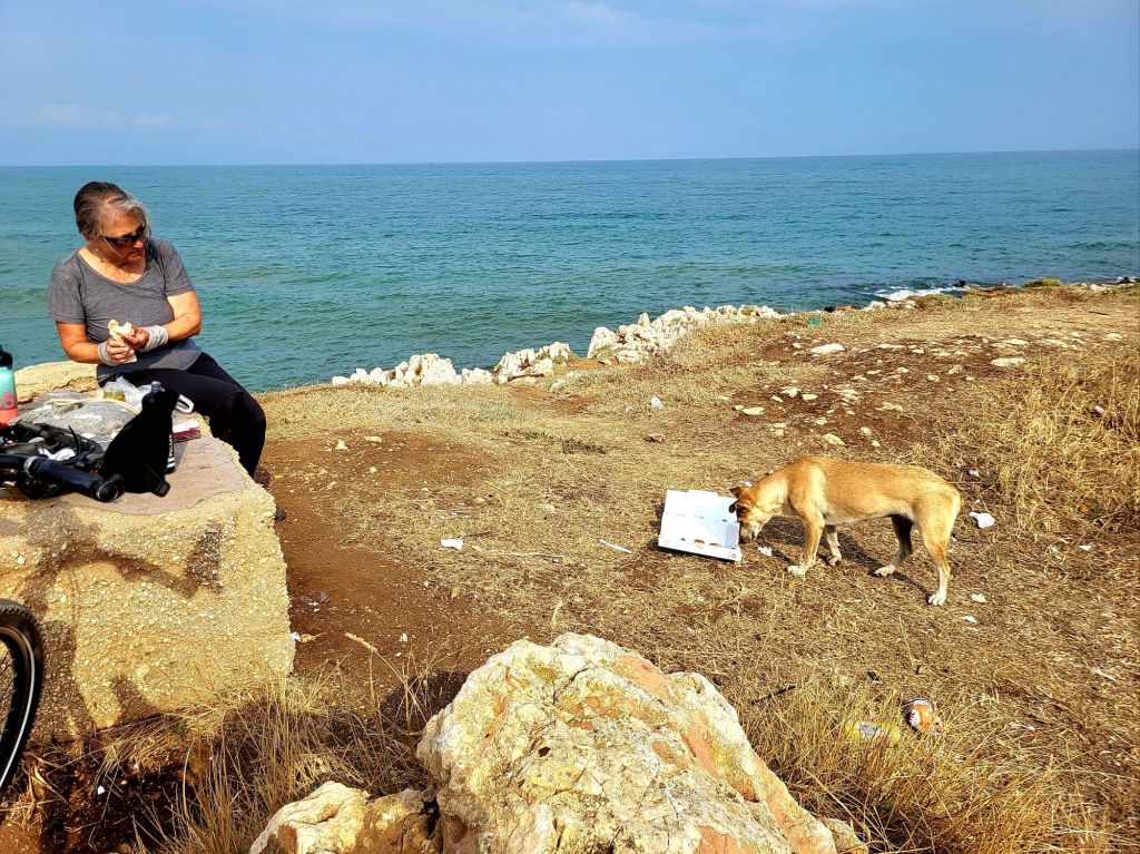 Ich hatte mich sehr auf diesen Abschnitt gefreut und unter anderem deshalb in der 6. Etappe nach Gallipolie an’s ionische Meer gewechselt, damit wir auf diesem Abschnitt das Meer auf „unserer Strassenseite“ haben würden. Leider spielte mir das Wetter einen Streich. Der Himmel war stark bewölkt und bis ins Ziel gab es keine Sonnenstrahlen, dafür ab und zu Regentropfen, so dass wir sogar die leichten Regenjacken hervor kramten. So verschwammen das Meer und die Wolkendecke zu einem „grauen Brei“. Schlecht um schöne, kontrastreiche Fotos zu schiessen.
