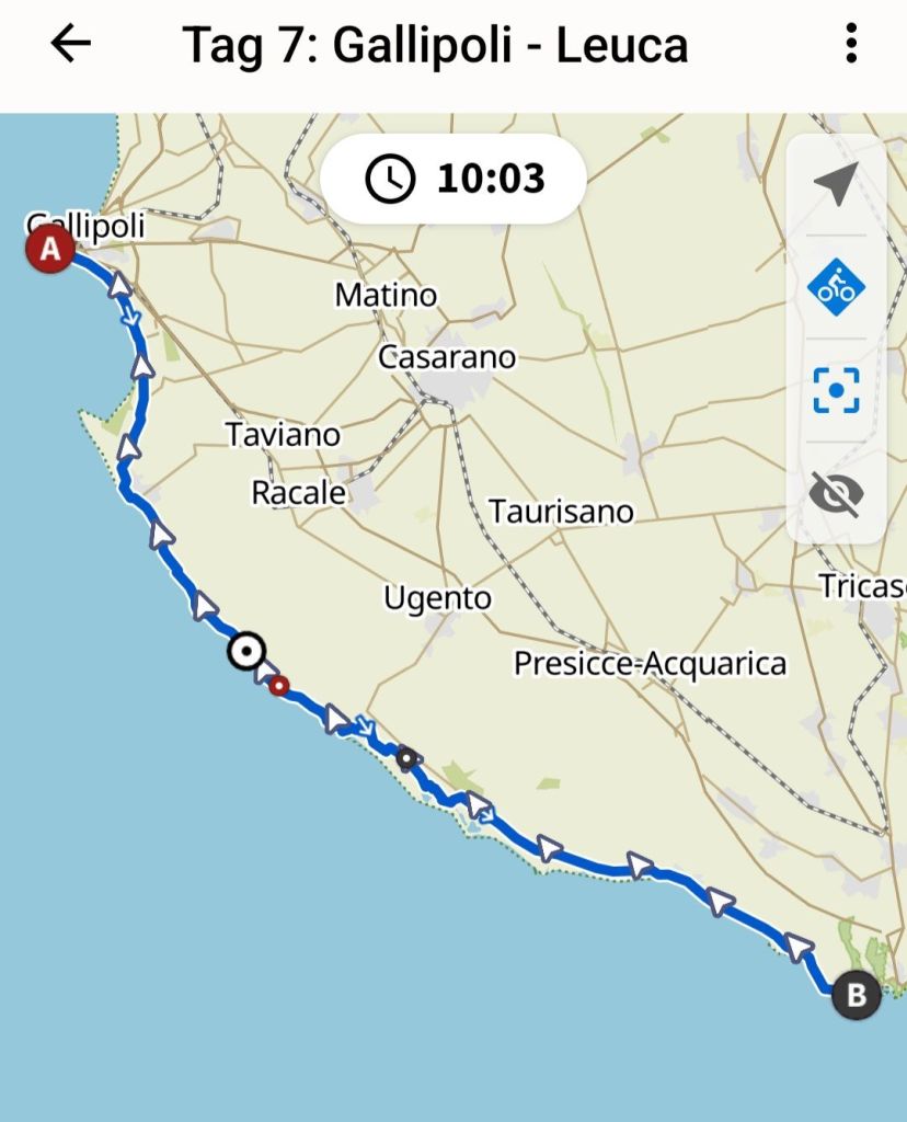 Morgen haben wir hier unseren letzten Ruhetag. Am Sonntag gibt es dann noch den letzten Abschnitt nach Lecce. Bis dann.