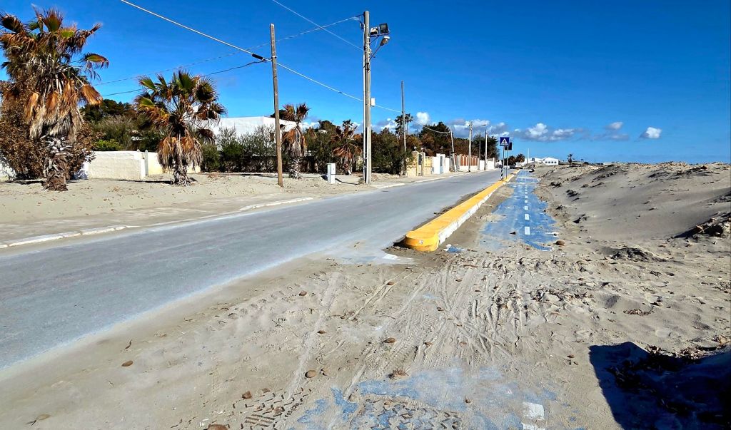 Schilder warnten vor Seegras auf der Fahrbahn. Zum Glück war es schon weggeräumt.Sand bis in die Vorgärten auf der anderen Strassenseite.
