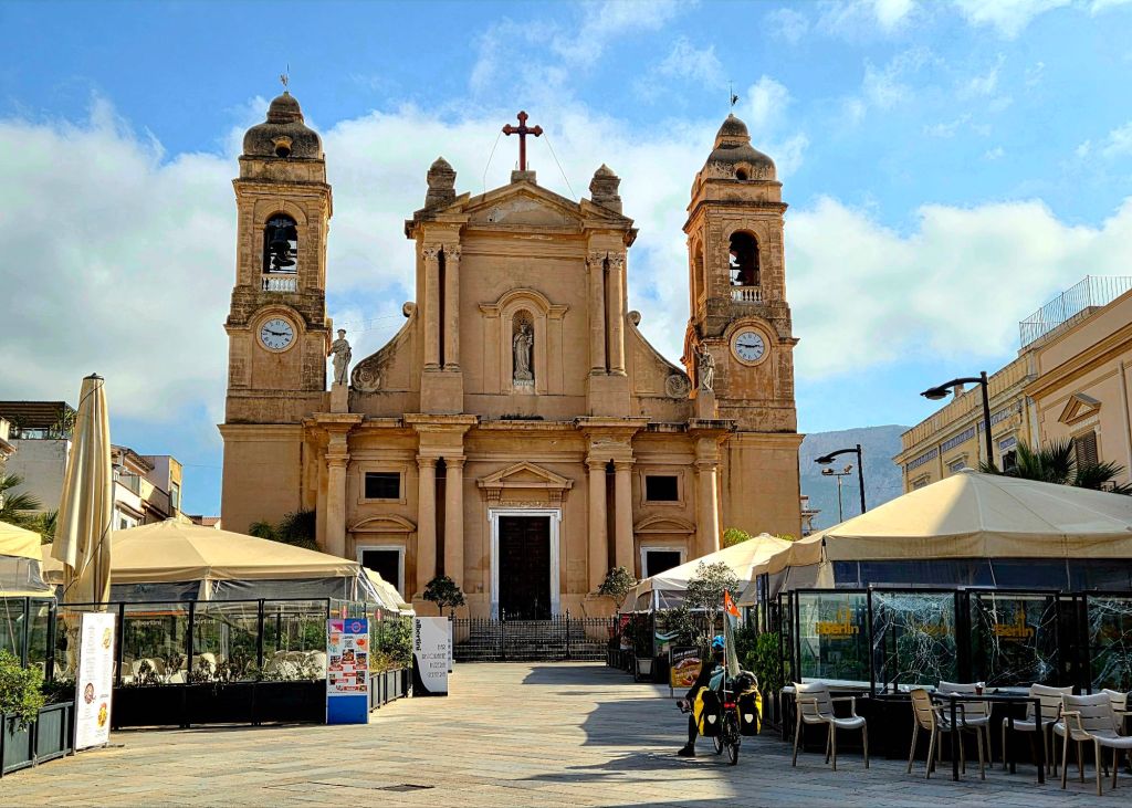 Pünktlich auf die italienische Mittagszeit, dass heiss um 13.30h, erreichten wir Terrasini. Ein hübscher kleiner Ort, wo wir in der Nähe des Doms ein schönes Restaurant fanden. Die Portionen eher klein, dafür von exquisiter Qualität. So war der Bauch nach der Pause nicht zu voll um weiter radeln zu können und doch hatten wir uns wieder etwas die Energiespeicher gefüllt.