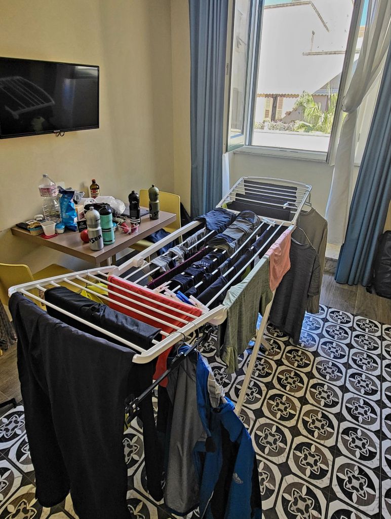 Alles Trocken! Ein Hotelzimmer mit Wäscheständer. Genau was wir brauchten.