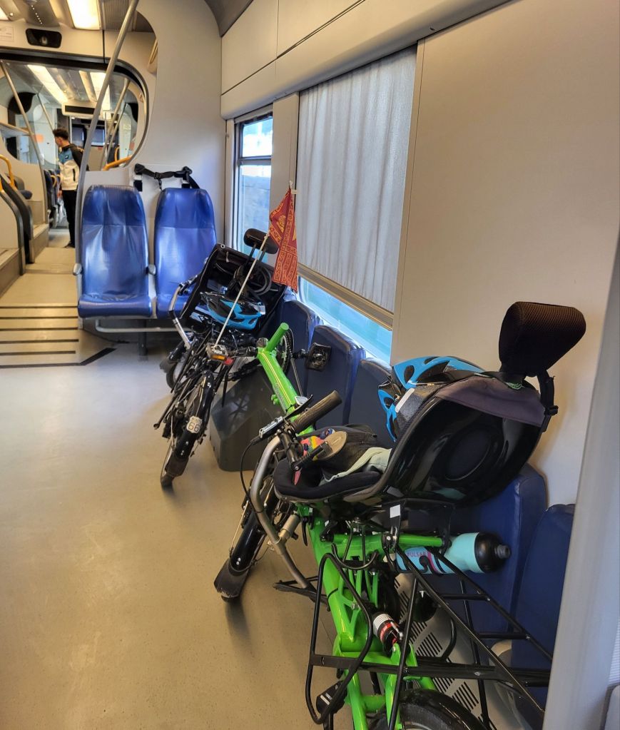 Vor einem Spiegel fotografiert. Also nur halb soviel wie ihr vermutet, aber wir sind gewappnet.Die Lieger für einmal nicht gefaltet. Nur den Sitz entfernen und sie passen auch so in’s Abteil.