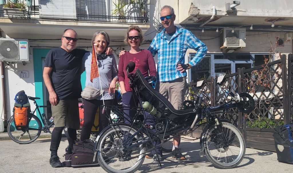 Nach etwa 20 Kilometern machten wir auf einem Hügel eine kleine Verschnaufpause und werden just in diesem Moment von zwei Tourenradlern eingeholt.