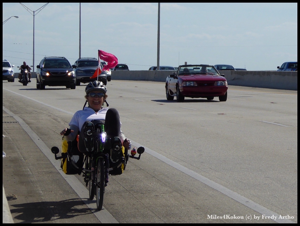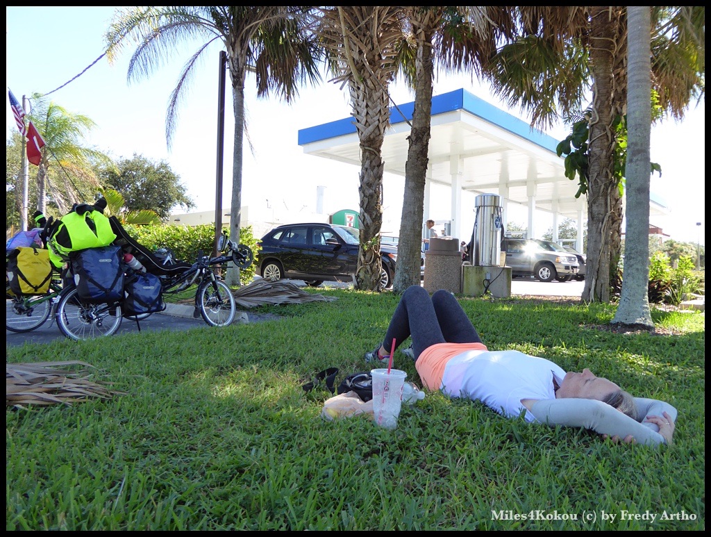 Während unserer Rast fuhr ein Mann in unserem Alter auf einem alten, aber soweit gepflegten Fahrrad zu uns hin. Obwohl er einen sauberen Eindruck machte war unschwer zu erkennen, dass er wohl in einer wirtschaftlich schwierigen Lage steckte. Vermutlich ohne Job und Arbeit. Er fragte ob ich ihm nicht 50 Cent’s geben könnte. Vermutlich dachte er, dass wir Radfahrer selber nicht allzu reich seien, sonst würden wir ja mit einem Auto unterwegs sein. Ich gab ihm ein paar Dollar und er freute sich riesig. Dann wieder die Frage nach dem „wohin“. Aber diesmal hörten wir eine verblüffend andere Antwort, die ich ihm auch sofort glauben konnte. „New Orleans, von da bin ich mit meinem Fahrrad auch hierher gefahren“ erzählte er. Ob wir Tipps bräuchten, er uns helfen könnte. Und ja in den verschiedenen Parks könne man prima wild Campen, man müsse halt einfach aufpassen und das Zelt erst im Dunkeln aufzustellen, damit einem die Ranger nicht sehen. Es sei auch sehr schmutzig auf der Strasse und wir würden viel Platten haben. Er habe sich ja extra spezielle Reifen und ein grünes Dichtmittel in den Schlauch gefüllt, das habe prima geholfen. Ich sagte ihm, wir hätten ebenfalls gute Reifen drauf und in Key West die Reifen mit derselben grünen Dichtmasse befüllt. Da huschte ein Lächeln über sein Gesicht: „That’s good man, god bless you and have a safe Trip“. Er drehte sich um und fuhr davon.
