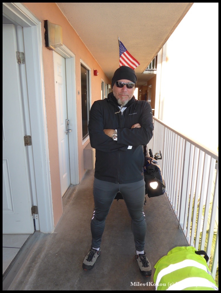 Wir sind heute extra früh aufgestanden, denn wir wussten aus dem Wetterbericht, nicht nur die Teilnehmer des IRONMAN Wettkampfs in Panama City Beach, sondern auch wir mussten uns auf sehr unangenehme Wetterverhältnisse einstellen. Schon die Kleiderauswahl erwies sich als nicht ganz einfach. Nach diversen Versuchen standen wir um 8 Uhr in der Montur „kurze Winterausfahrt an einem kühlen aber schönen Januartag“, startbereit vor dem Hotel.