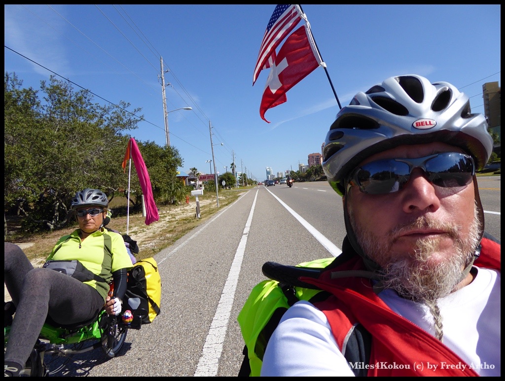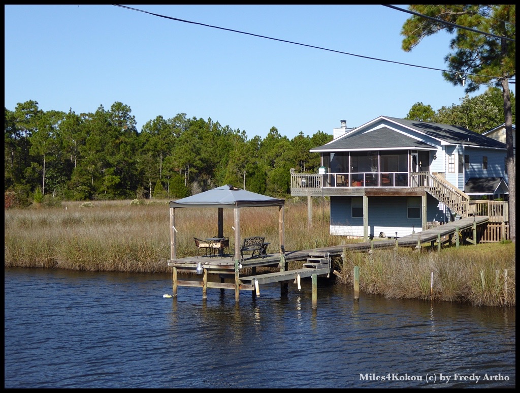 Nach und nach nahmen die Hotelbunker ab und machten schmucken Ferienhäusern Platz. Diese waren, wie überall an der Golfküste, mehrheitlich auf einem Holzgerüst gebaut, um im Falle einer Überflutung weniger Schaden zu nehmen. Der Verkehr wurde ebenfalls weniger und wir genossen die lockere Fahrt. Plötzlich wie aus dem Nichts tauchte eine Tafel mit der Aufschrift: „Dead End“ auf. „Nein, nicht schon wieder“ fuhr es mir durch den Kopf, als wir an einer Schranke standen, welche die letzte Siedlung hier Bewachte und jedem Fremden den Zutritt verwehrte. Das Navi kannte keine Gnade und zeigte mir, dass wir einen Abzweigung vor 10 km. verpasst hatten. Aller Ärger machte die Sache auch nicht besser und wir mussten gegen den starken Wind zurückfahren. Die nächsten gut 45 Minuten kosteten viel Kraft und wir waren froh, als wir den Abzweigpunkt erreicht hatten. Wir konnten uns wenigstens damit motivieren, wieder ein paar Zusatzmeilen für Kokou gefahren zu sein.