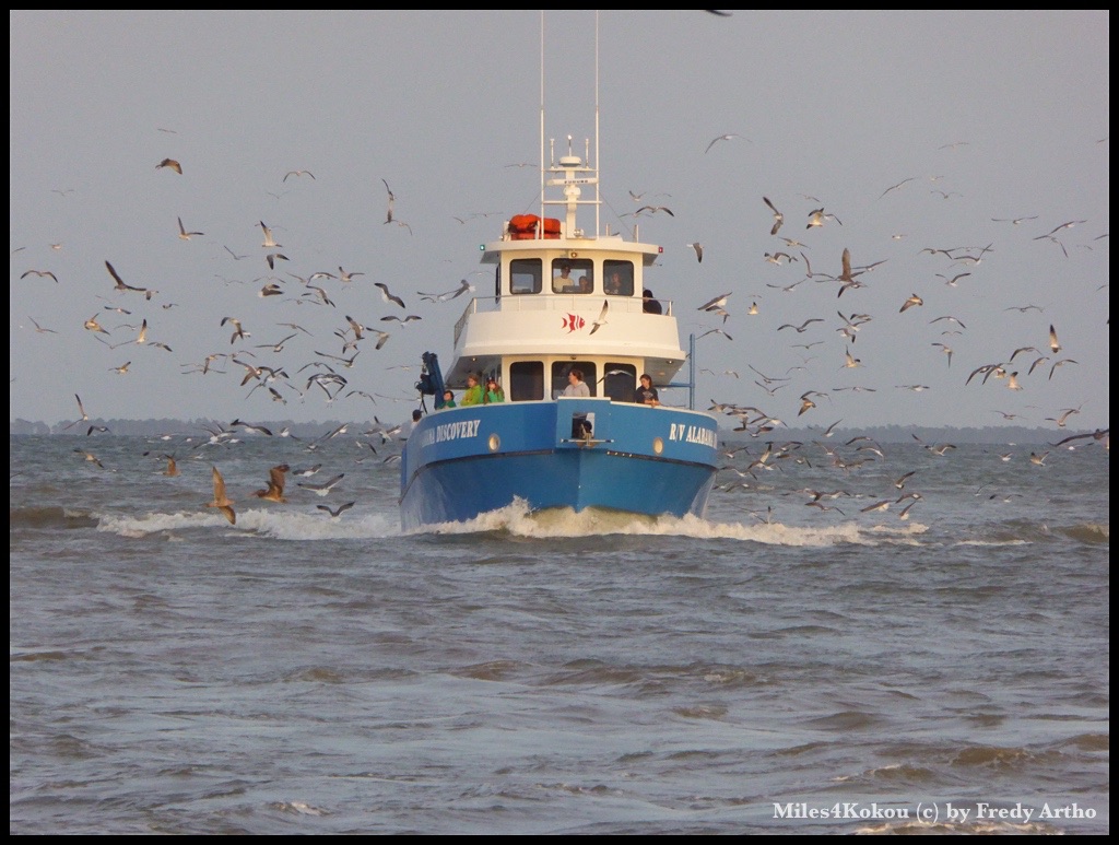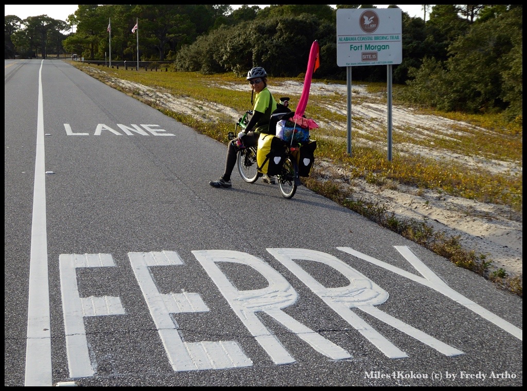 Ich versuchte es dann mit der Version 2 Eier, Modell „Sonnenseite oben“ (=Spiegelei) zwei Speckstreifen und zwei Pankakes. Diese waren aber so süss, dass ich nach dem ersten kapitulieren musste. Da hatte Barbara mit der Vegiomlette eindeutig besser gewählt. Dann habe ich noch telefonisch abgeklärt, ob die Fähre heute in Betrieb ist und nach der positiven Antwort das Motelzimmer in Dauphine Island gebucht. Da der Wind auch noch die Richtung gewechselt hatte und uns heute von hinten unterstützen würde, stand einer gemütlichen Sonntagsfahrt an einem Montag nichts mehr im Wege.