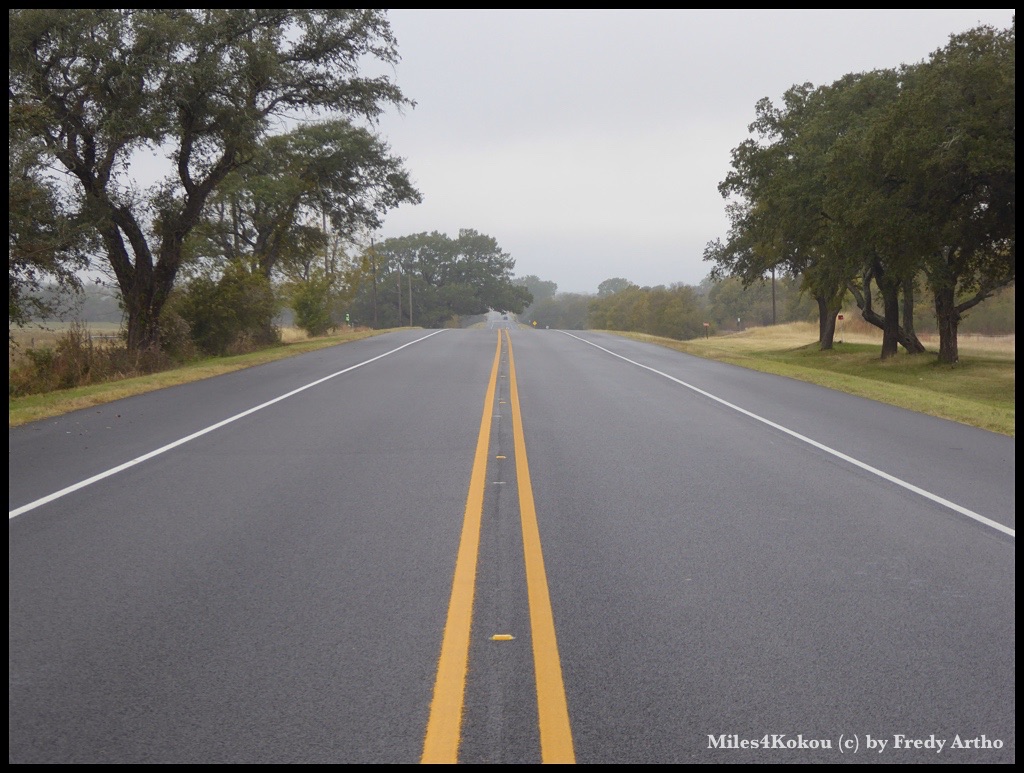 Bei diesen Wetterprognosen wollte ich nicht riskieren am Nachmittag noch im Regen fahren zu müssen. Die ersten acht Kilometer liefen perfekt und ich konnte auf feinstem Asphalt die Hügel, die sich hier endlos aneinanderreihen, in Angriff nehmen. Doch leider war der guten Strassenbelag nur von kurzer Dauer und ich musste Bekanntschaft mit dem unter Velofahrern verpönten „Texas Chip Seal“ machen. Dieser Belag besteht aus sehr groben Steinen, welche ca 8 – 10 mm dick sind. Sie werden auf eine feine Asphaltmasse gestreut und mit der Zeit von den Autos dann „flachgefahren“. Aber eben leider nur dort, wo auch Autos fahren. An der Seite ist das ganze sehr rauh und beschert dem Velofahrer viel Rollwiderstand und eine dauernde Rüttelpiste.
