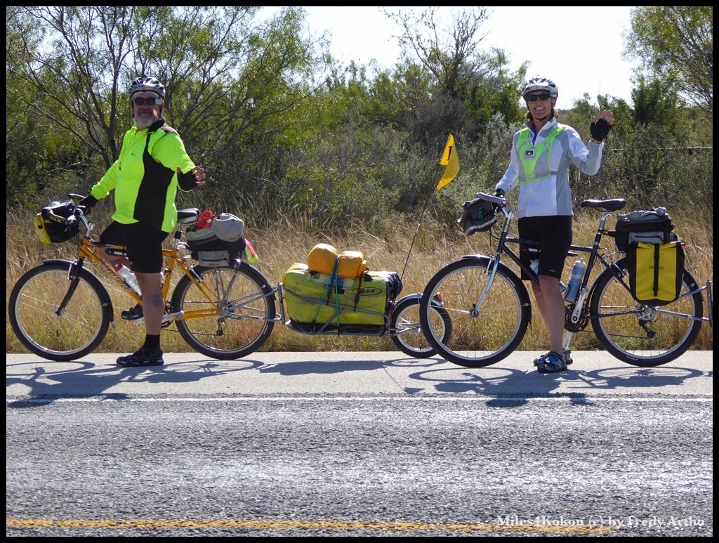 Das radfahrende Paar war unterwegs von El Paso nach Austin Texas. „Nur eine kurze Tour“ sagten sie. Immerhin gut 1200 Kilometer! Das ist doch schon ein ganzes Stück. Und die beiden waren auf ungefederten Rädern unterwegs! 😦 Ja es sei manchmal ziemlich schlimm gewesen, berichteten sie. Da kann ich mich ja noch auf etwas gefasst machen. Sie haben übrigens in Langtry auch im Trailer übernachtet und es hat ihnen gefallen.