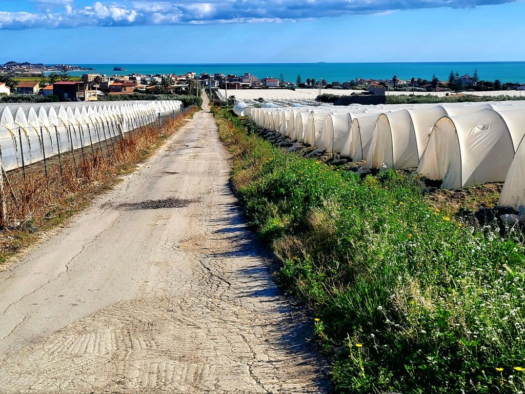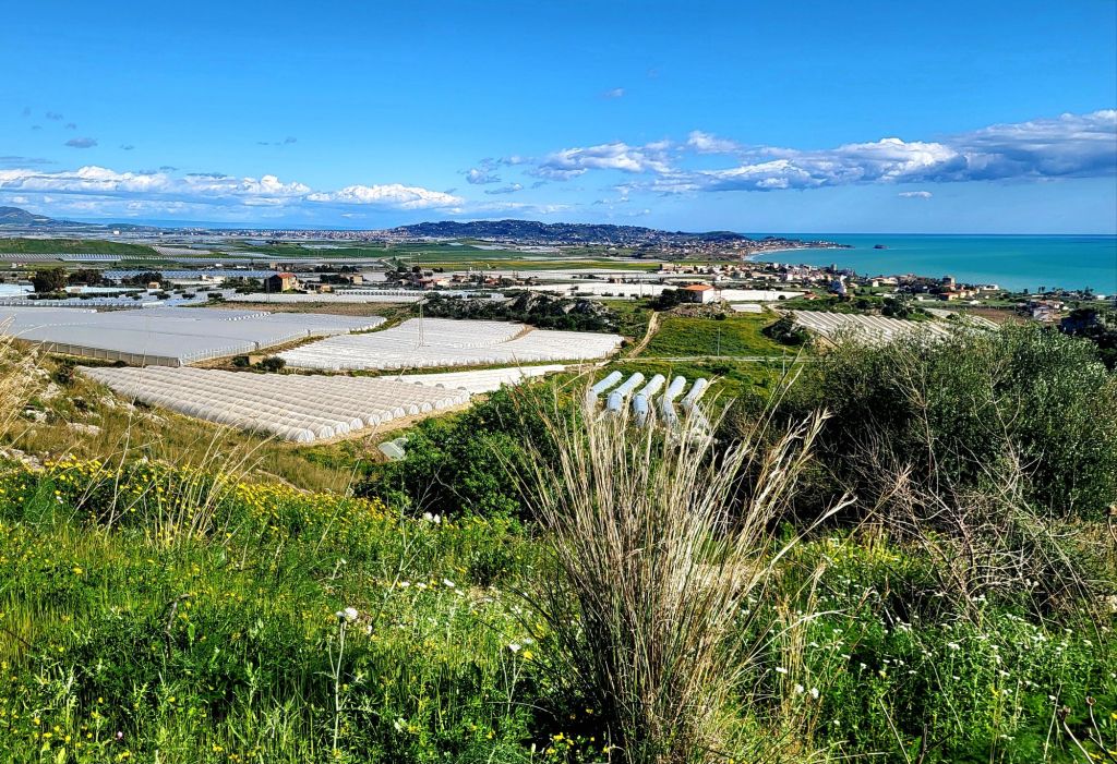 Auch bei diesen grossen Treibhausanlagen sehen wir immer wieder Berge von altem Plastik, der vor sich hin rottet und vom Wind weggeweht wird. Dies ist leider die unschöne Seite Siziliens.