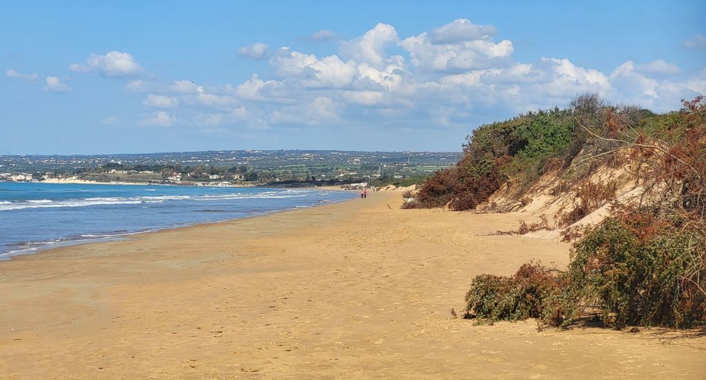Kurz nach Pozzallo passierten wir einen Abschnitt, wo die Strasse nur durch hohe Sanddünnen vom Strand getrennt war. Da und dort wurde der Sand in die Fahrbahn geweht, so das die rechte Spur Zentimeter hoch bedeckt war. Ich bin gespannt, ob die Dünnen über kurz oder lang die Strasse unter sich begraben werden.
