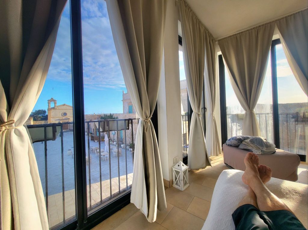 Das Zimmer konnten wir bereits beziehen und da heute der wärmste und sonnigste Tag war, war die schöne Dachterrasse, welche den alten Dorfplatz überblickte, der perfekte Spot um den Nachmittag zu geniessen.