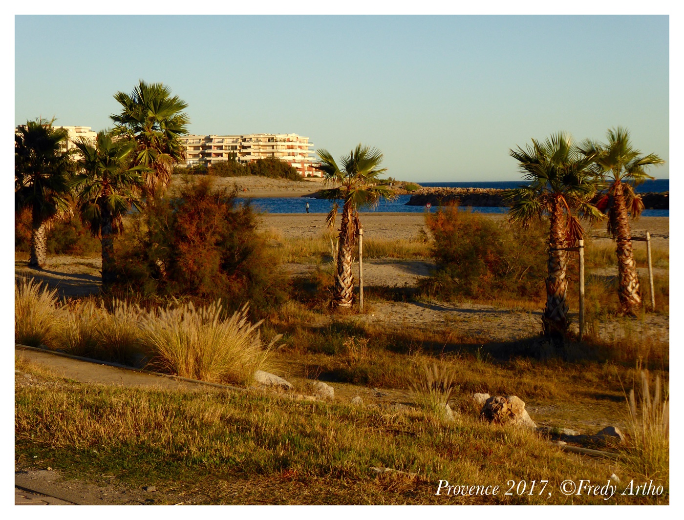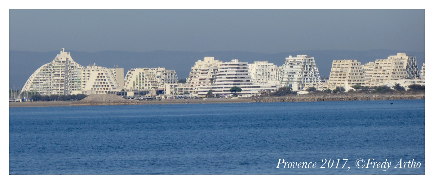 Dann bogen wir rechts ab, immer möglichst der Küste entlang. Schon aus der Ferne erblickten wir die Rettortenstadt „La Grande-Motte“, die mit ihren riesigen Appartementsgebäuden aus den 60er Jahren fast wie eine Filmkulisse aus einem alten Science Fiction Film wirkt. Der Betonbau hatte damals seine Blütezeit und jeder Architekt schien sich mit kreativen Bauten verwirklichen zu wollen. Alles klar durchstrukturiert und selbst die Strandpromenade war Teil dieses Ensembles. Leider zum Radfahren nicht wirklich gut geeignet da sich der Betonplattenweg durch die Bäume schlängelte und einige Spaziergänger unterwegs waren, so dass wir nur langsam vorwärts kamen.