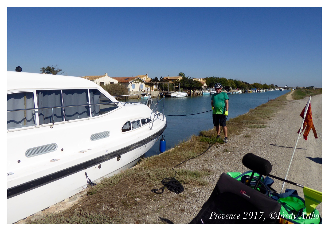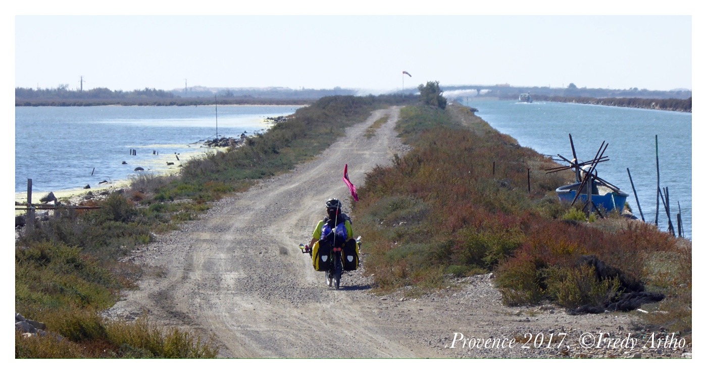 Nachdem wir diesen seltsamen Ort verlassen hatten genossen wir wieder einen tollen Radweg, der immer hinter den Sanddünen verlief und ab und zu den Blick aufs Meer freigab. In Palava-les-Flots bogen wir dann auf einen schmalen Kiesweg ein, der mitten durch die Lagunen führte. Das Fahrradverbot übersahen wir grosszügig und waren damit nicht alleine. Immer wieder trafen wir auf Fischer die mit ihren Velos oder Motorrollern hier hinausfahren, um ihrem Hobby zu frönen. Gleich neben dem Damm verlief auch die Fahrrinne welche die Hausbootmieter auf dem Weg von Sète in den Canal-du-Midi nehmen müssen. Wohl etwa 15 Kilometer radelten wir auf diesem Damm der einen mehr oder weniger akzeptablen Kiesbelag hatte. Wegen des holprigen Untergrunds nahmen wir es aber gemütlich und stoppten auch ab und zu für einen Blick übers Wasser. Schon ein spezielles Gefühl so „übers Wasser“ zu radeln.