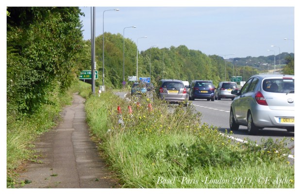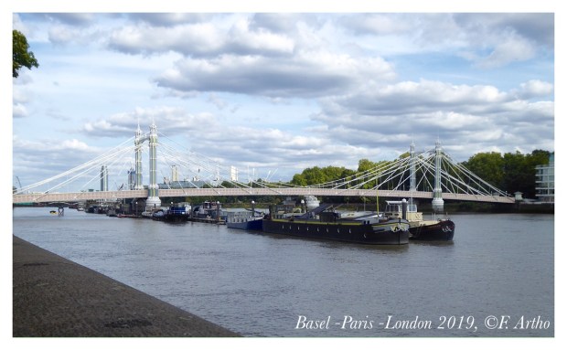 Nach einer Stärkung in einem gemütlichen Pub am Fluss ging es weiter und wurde leider nicht besser. Viel auf Gehsteigen mit dauernden Einmündungen und Bodenwellen. Je näher am Zentrum desto mehr Verkehr, Baustellen mit gesperrten Fahrspuren, noch mehr Gedränge etc. Die Strassensperrung zwang uns wieder zu einem Kurswechsel und ohne Navi wären wir wohl etwas verloren gewesen. Es zeigte uns zum Glück den Weg durch nur wenig befahrene Quartierstrassen zur Chelseabridg.