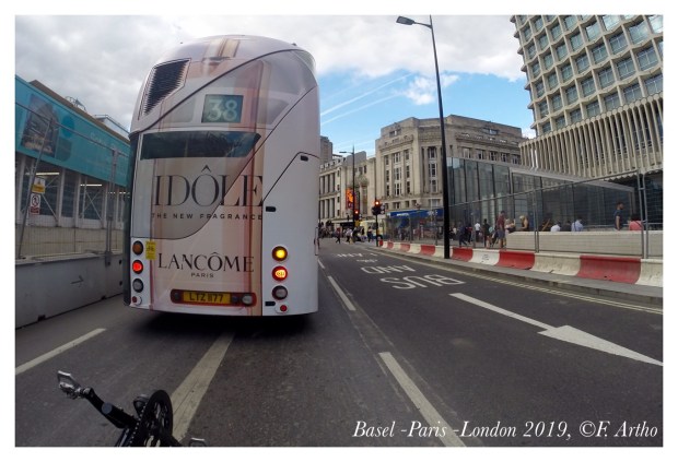 Von dort noch etwas der Themse entlang. Gewisse Abschnitte mit breiten blauen Radstreifen waren richtig gut. Nun mussten wir noch quer durchs Zentrum via Westminster in die Nähe des Bahnhofs Pancras, wo wir unsere Unterkunft hatten. Manchmal waren wir zwischen den sich stauenden Autos und Bussen eingeklemmt, manchmal gab es wieder ein paar Meter Radstreiffen.