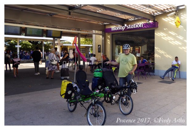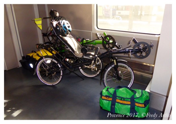 Als der Zug einfuhr staunten wir nicht schlecht wie gut er schon belegt war. Zudem war heute wohl ein „Umzugstermin“, denn viele Reisende hatten grosse Taschen dabei. Mit andern Worten, die Gepäckablage im Gang war bereits voll belegt. Uns blieb nichts anderes übrig als die Räder vor dem Gepäckabteil in den Gang zu stellen. Dabei achteten wir darauf das trotzdem ein Durchgang frei blieb. Das schien den Grundanforderungen zu genügen, denn kein Schaffner beschwerte sich sonder einer fragte nur: „Sind das eure Räder? Schaut doch bitte mal an der Haltestelle nach, falls jemand sein Gepäck hervorholen will.“ Klar machten wir das, aber eigentlich stiegen nur immer mehr Leute ein. Gut 10 Min. vor Lyon machten wir uns auf um unsere Radtaschen am Ausgang bereit zu stellen, so dass wir als erste aussteigen konnten um den andern nicht mehr im Weg zu stehen. Es klappte ganz gut und in Lyon bauten wir auf dem Perron die Räder wieder zusammen, denn im TER erwarteten wir Fahrradhaken im Veloabteil. So war es auch und wir konnten die Räder bequem aufhängen.