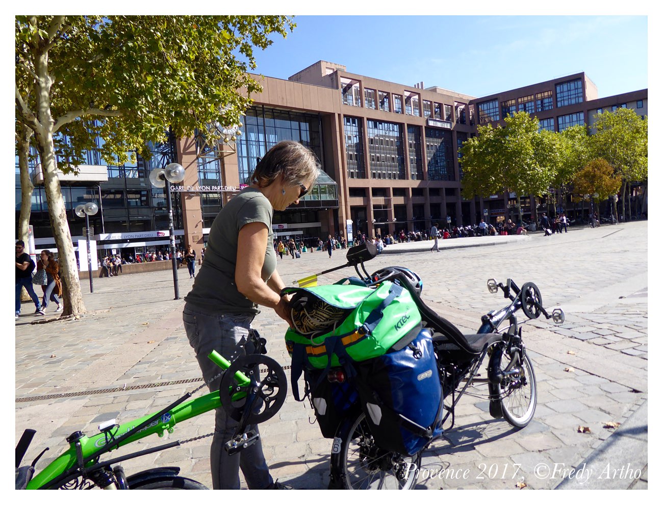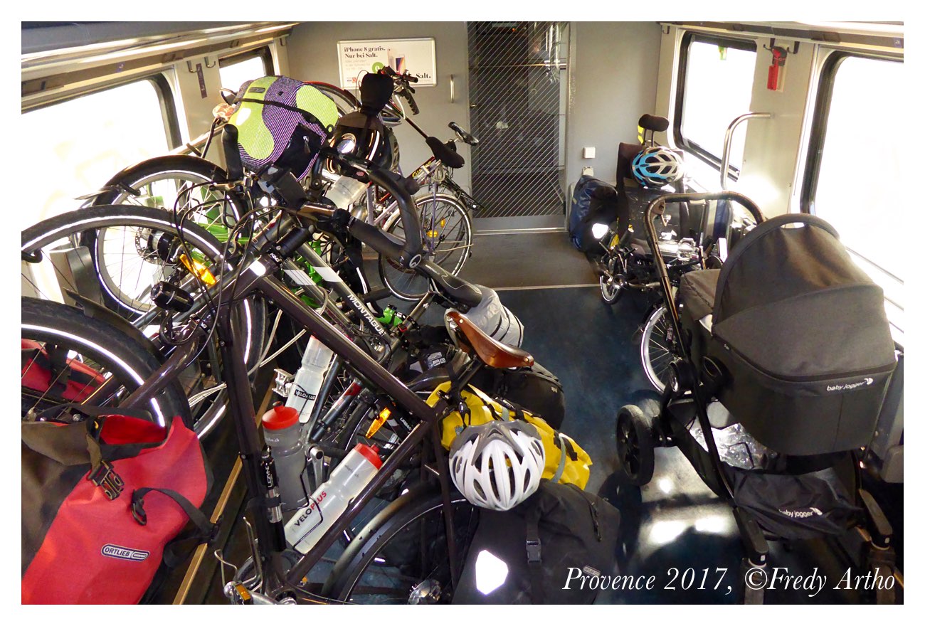 Als der Zug einfuhr staunten wir nicht schlecht wie gut er schon belegt war. Zudem war heute wohl ein „Umzugstermin“, denn viele Reisende hatten grosse Taschen dabei. Mit andern Worten, die Gepäckablage im Gang war bereits voll belegt. Uns blieb nichts anderes übrig als die Räder vor dem Gepäckabteil in den Gang zu stellen. Dabei achteten wir darauf das trotzdem ein Durchgang frei blieb. Das schien den Grundanforderungen zu genügen, denn kein Schaffner beschwerte sich sonder einer fragte nur: „Sind das eure Räder? Schaut doch bitte mal an der Haltestelle nach, falls jemand sein Gepäck hervorholen will.“ Klar machten wir das, aber eigentlich stiegen nur immer mehr Leute ein. Gut 10 Min. vor Lyon machten wir uns auf um unsere Radtaschen am Ausgang bereit zu stellen, so dass wir als erste aussteigen konnten um den andern nicht mehr im Weg zu stehen. Es klappte ganz gut und in Lyon bauten wir auf dem Perron die Räder wieder zusammen, denn im TER erwarteten wir Fahrradhaken im Veloabteil. So war es auch und wir konnten die Räder bequem aufhängen.