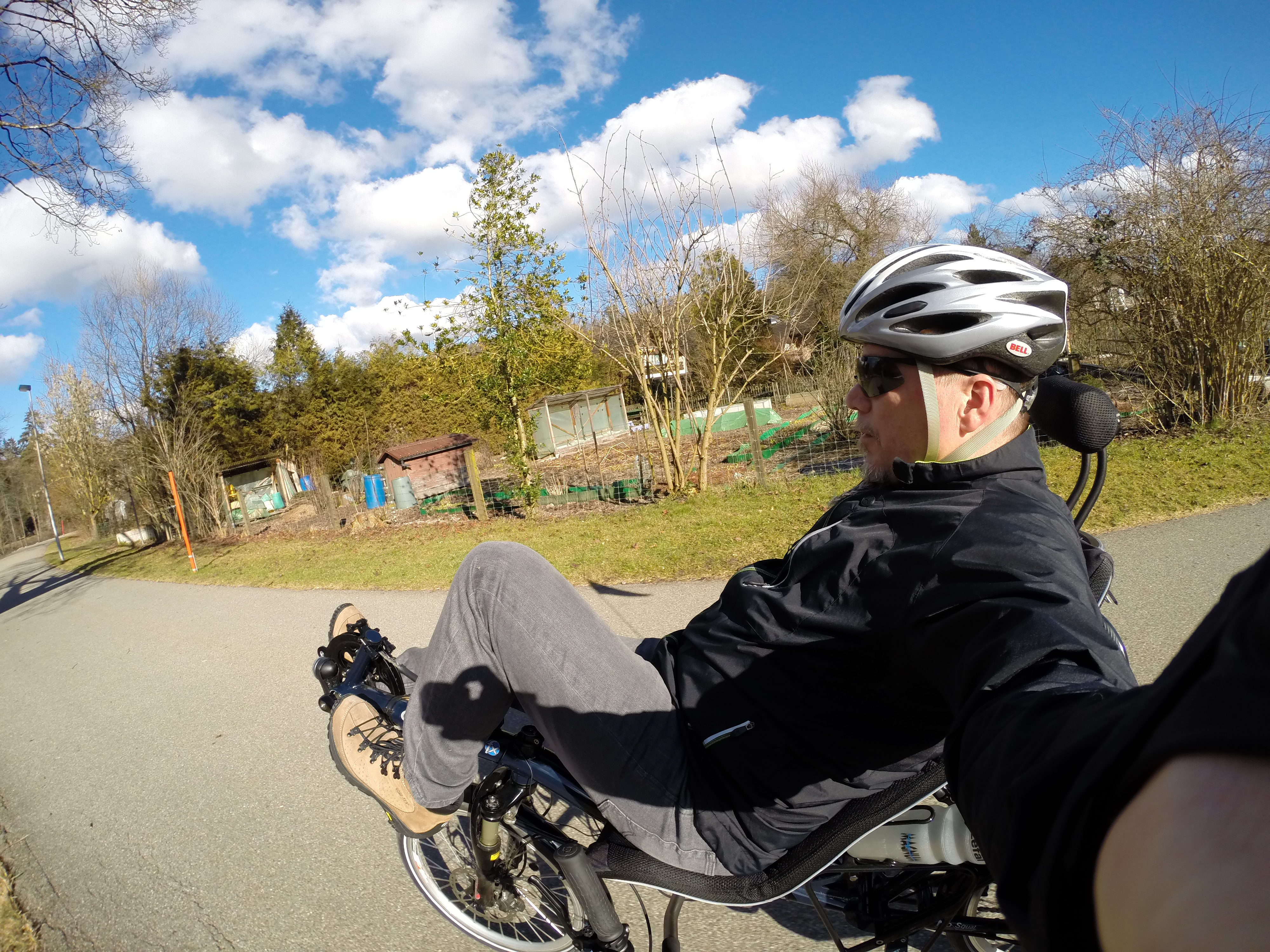 Vor dem Losfahren nochmal einen Kontrollblick auf den eingelegten Gang, ist dieser zu gross, dürfte der Versuch scheitern. Ich fahre mit meiner Rohloff Nabenschaltung in der Regel im 3-5 Gang los. Der erste Antritt soll kräftig erfolgen, so dass das Rad schon mal Geschwindigkeit aufnimmt. Die brauchst du nämlich weil du für einen kurzen Moment mit diesem Schwung rollen musst, bevor du deinen zweiten Fuss (ex Standfuss) auf der Pedale hast und nun in einen runden Tritt übergehen kannst. Rasch in den richtigen „Cruisinggang“ schalten, zurücklehnen und geniessen. Sobald du nämlich einmal fährst, offenbaren sich die Vorzüge eines Liegerads wie von selbst. Entspanntes Zurücklehnen, die Aussicht geniessen und fahren ohne Nacken-, Rücken-, Gesäss- oder Handgelenksschmerzen. Mit einem normalen Fahrrad bin ich seit einer Operation an den Halswirbelsäule jeweils spätestens nach einer Fahrstunde im Nacken so stark verkrampft, dass das Fahren zur Tortur wird. Mit dem Lieger gehört das der Vergangenheit an und wenn ich nach mehrstündigen Fahrten vom Rad steige merke ich höchstens an den Oberschenkeln, dass ich nicht nur rasch um die Ecke gefahren bin.