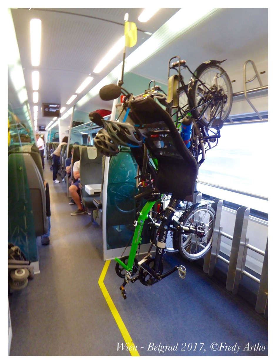 Unverpackt passen die Räder an die üblichen Velohaken in den Zügen, wobei Barbara’s Tretlagerausleger wegen der längeren Beine etwas mehr ausgezogen ist und somit bei „tief montierten“ Haken manchmal fast am Boden aufsteht. Meist klappt das aber problemlos. So reisen wir auch in Zügen wie zum Beispiel dem RER in Frankreich in denen eigentlich nur „normale Velos“ zugelassen sind. Wir hängen die Lieger an den Haken und stellen manchmal den Unterlenker etwas quer, damit am Nachbarhaken ein weiteres Rad Platz findet und hatten so noch nie Ärger. Für Notfälle ist immer der gefaltete Tranzbag im Gepäck und wir würden einfach „falten“.